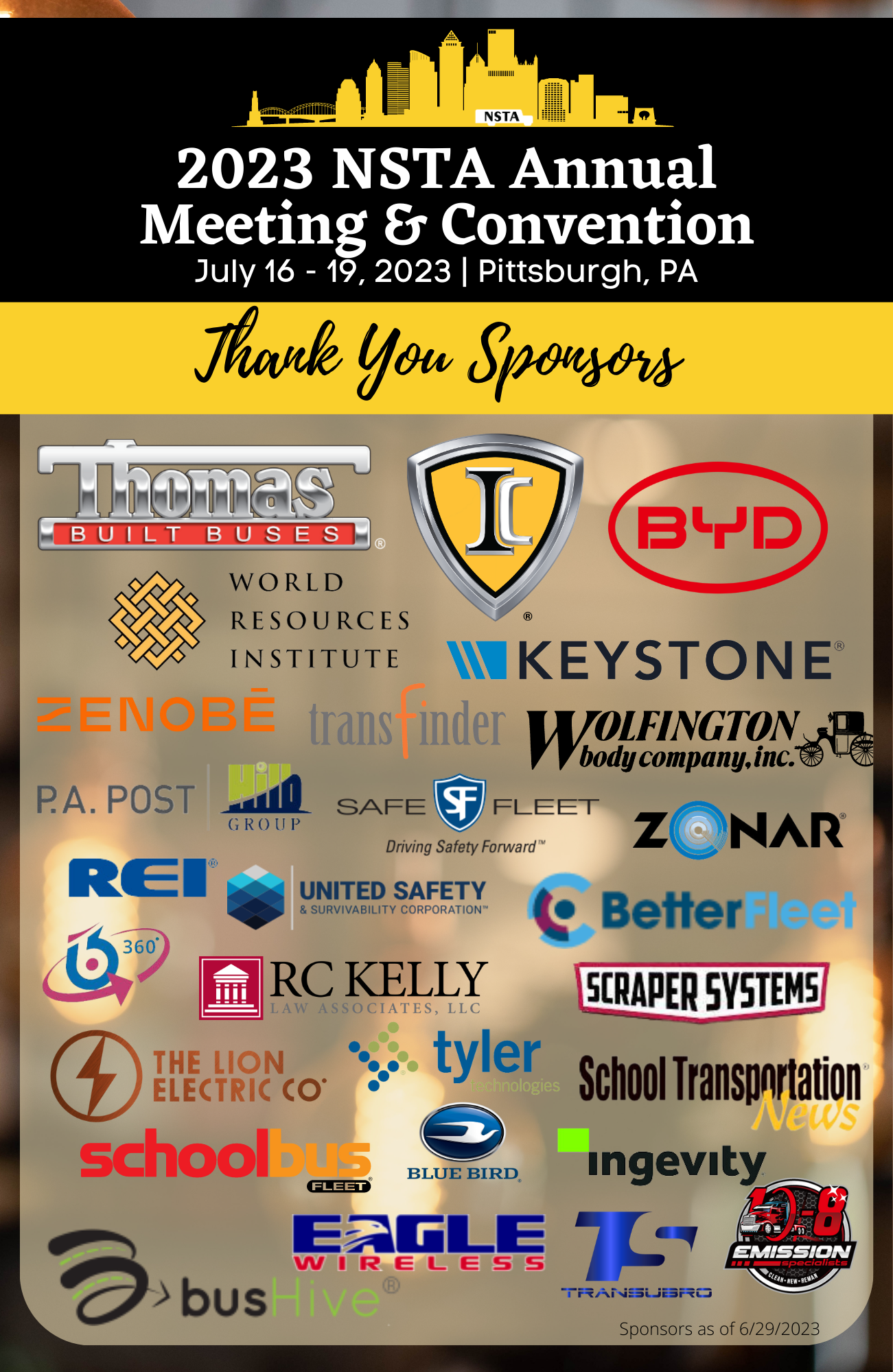 We would like to thank our first-time attendees and our Event Sponsors for making this a memorable program. A special thank you to our Platinum Event Sponsors - Blue Bird, IC Bus, and Thomas Built Buses for their support of the View Boston reception, Fenway Park President's Dinner, and the Awards and Installation Dinner.